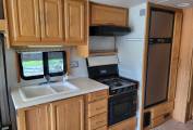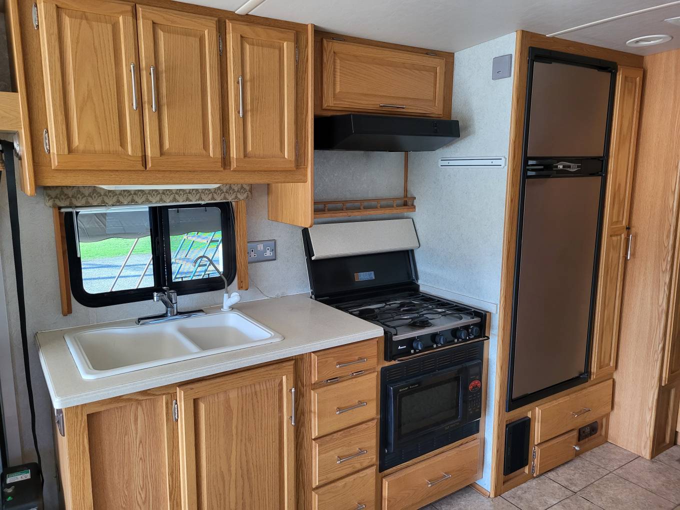 There is a large kitchen galley with full sized oven, spacious worktop, enormous fridge freezer, gas hob and sink.
